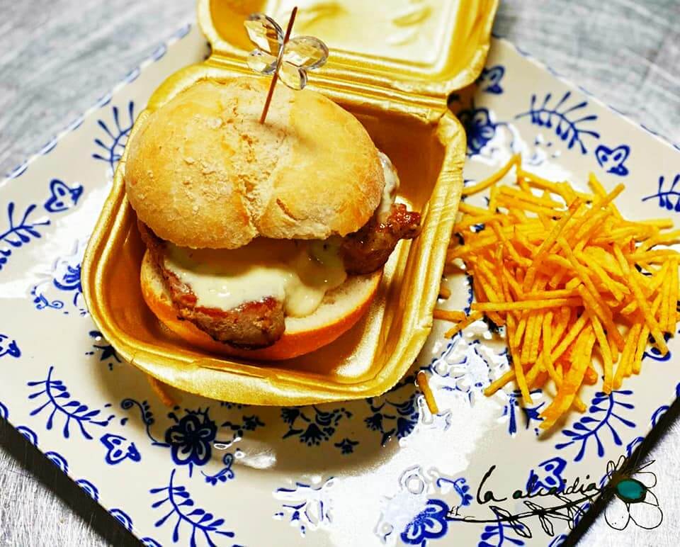 Panecillo gallego relleno de puntas de solomillo a los cuatro quesos y patatas paja.