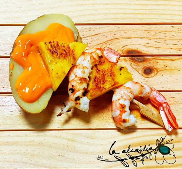 Brocheta de langostinos y piña con patata asada regada con mojo picón.