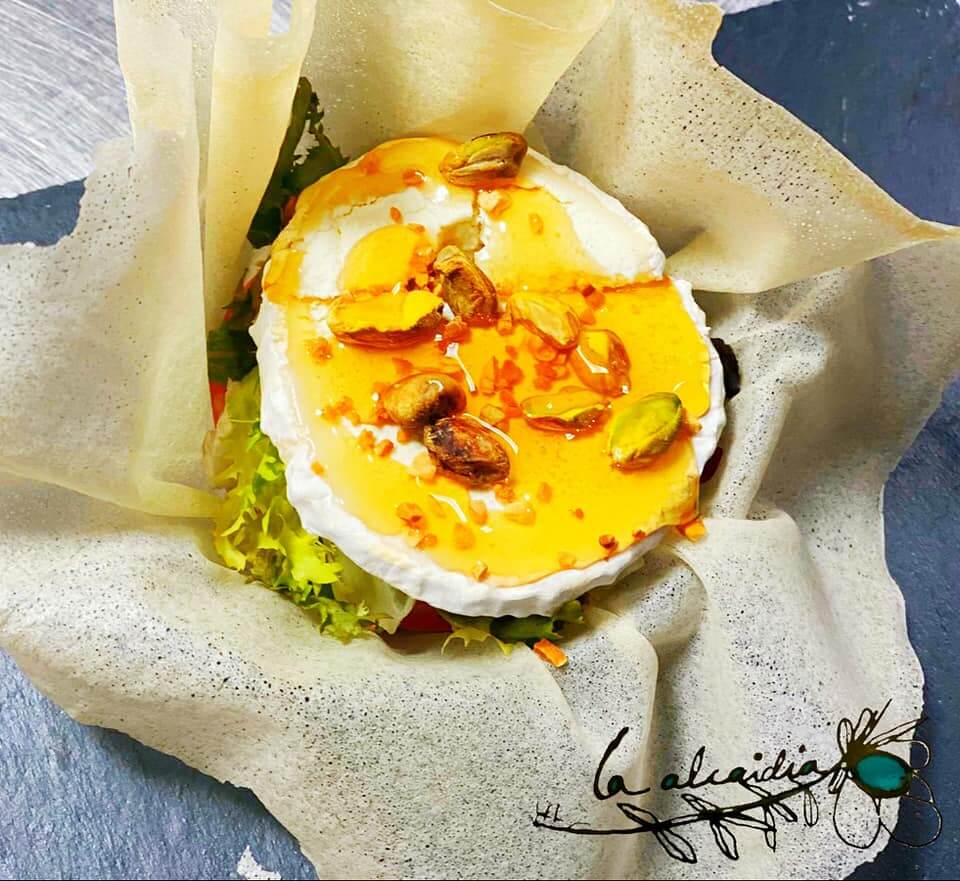 Ensalada de queso de cabra con mezclum, miel, almendra crujiente y pistacho sobre tulipa de pasta bric.