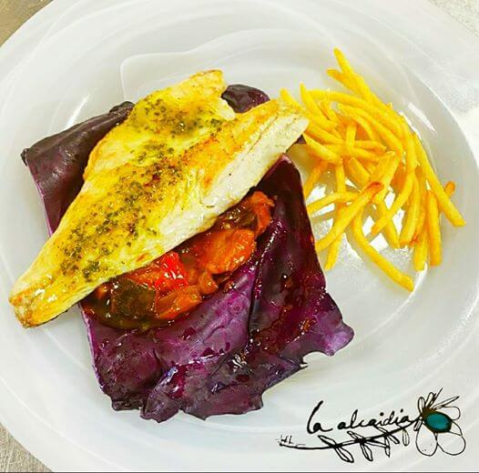 – Lubina a la plancha sobre cama de pisto y col lombarda morada acompañada de patatas paja caseras.